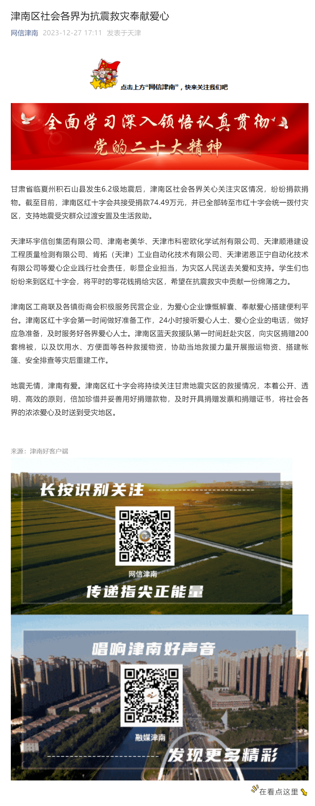 津南區社會各界為抗震救災奉獻愛心