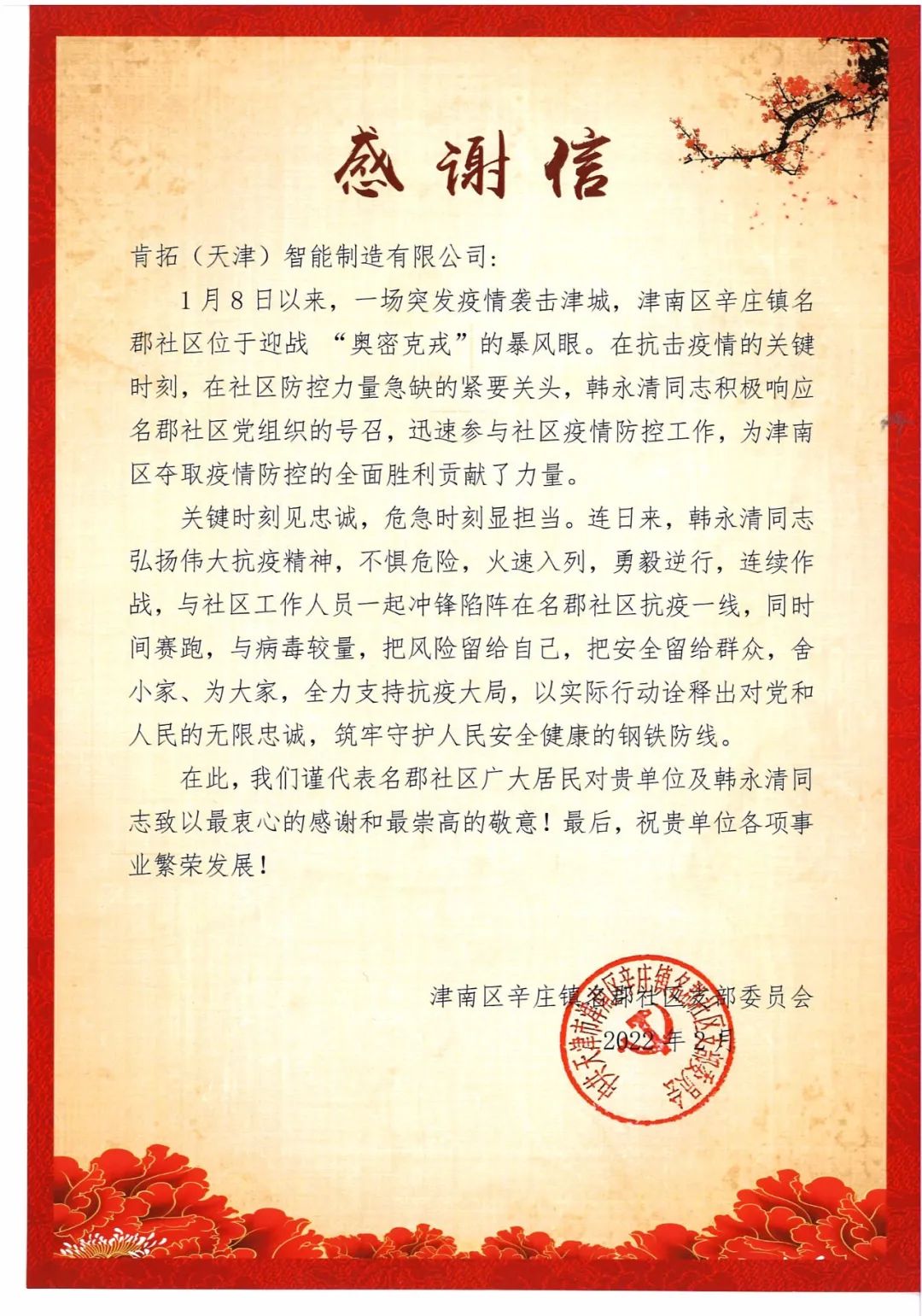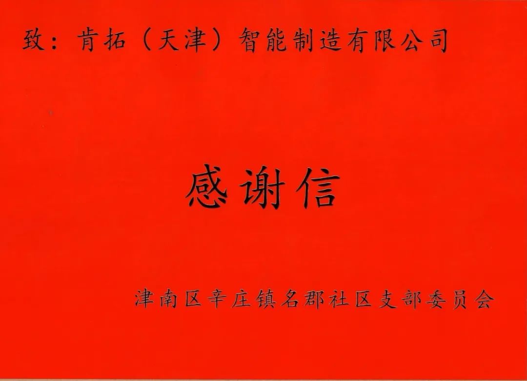(行政部文/影)2022年2月7日開班伊始,公司即收到來自津南區(qū)辛莊鎮(zhèn)名郡社區(qū)黨組織的感謝信。